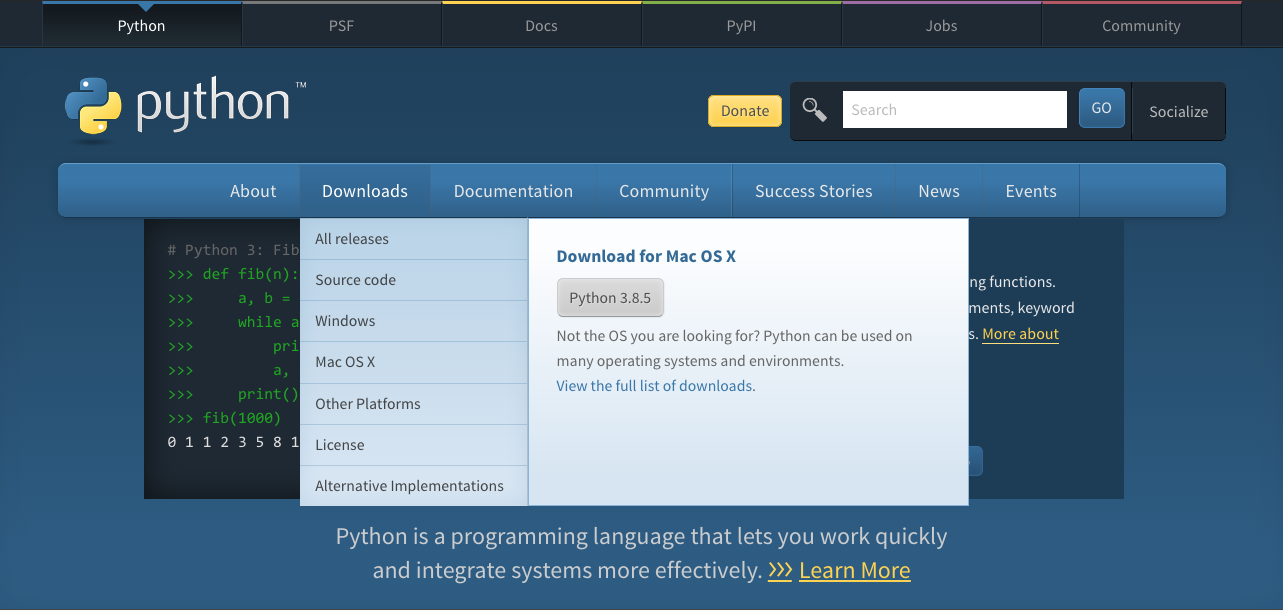 1. Python 공식 웹사이트(https://www.python.org/)에 접속하여 다운로드한다. (현재 최신 버전: Python3.8.5)