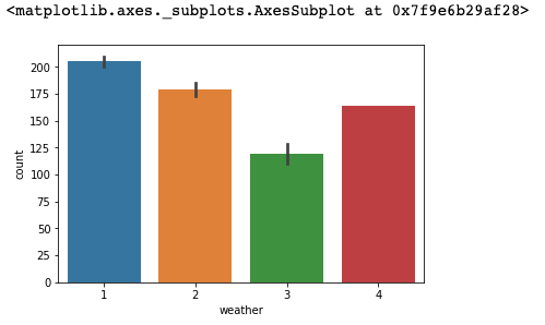 weather 별 그래프를 확인한 결과 날씨가 나쁠 수록 대여량이 줄어든다. 하지만 날씨가 가장 안좋은 4의 경우 3보다 대여수량이 높아보이지만 신뢰도 구간이 낮은 것을 확인 할 수 있다.