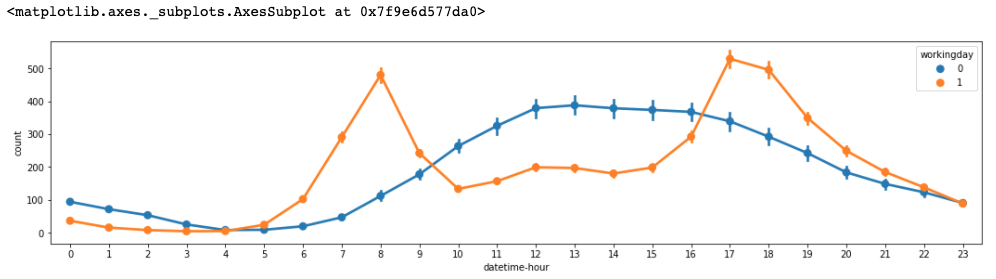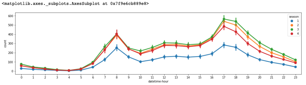 season별, 시간별 데이터를 보았을 때, 봄과 겨울이 대여량이 여름, 가을 보다 낮음을 알 수 있다. 출퇴근 시간의 대여량이 높은 것은 season에 상관없이 동일하다.