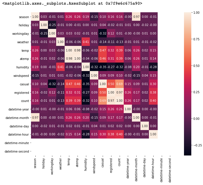 각 column 간의 상관도를 아래의 그래프를 통해서 확인 할 수 있다. count의 경우 temp, atemp, casual, registered, datetime-hour 에 연관도가 상대적으로 높은 것으로 보인다.
