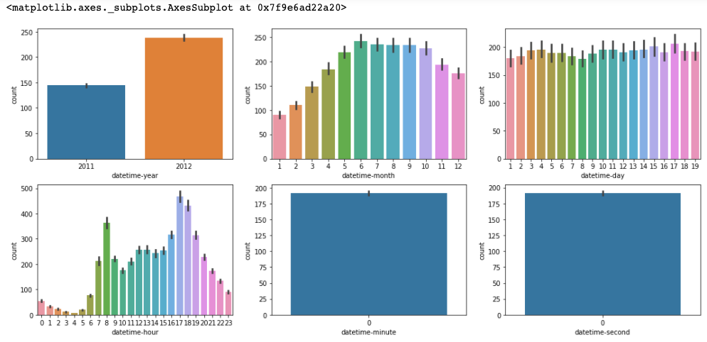 Date 와 시간 정보가 같이 포함하고 있는 'datetime' column을 연도별, 월별, 시간별 데이터 분석이 가능하도록 년, 월, 일, 시, 분, 초 column 으로 분리하여 추가합니다.