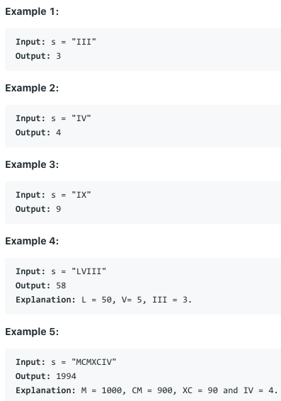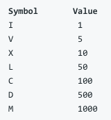 roman = {"I": 1, "V": 5, "X": 10, "L": 50, "C": 100, "D": 500, "M": 1000}