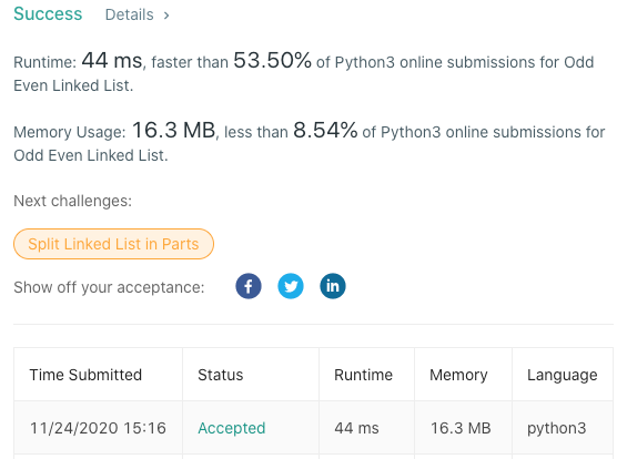 문제의 풀이 방법은 홀수번째 Node 만 계속 연결하고, 짝수번째 Node는 따로 연결하는 것을 반복하고, 최종 홀수 Node의 마지막 Node의 Next에 짝수 Node의 시작 Node를 지정하고 홀수 Node의 시작 Node를 반환하였습니다. Linked List에 대한 기본 개념을 알고 있다면, 문제 자체가 복잡하지 않아서, 코드도 비교적 간단 합니다. 아래의 코드를 참조 부탁 드립니다.