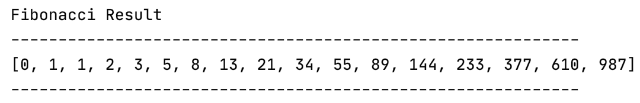 이번에도 이전과 함수와 같이 max = 1000 미만의 Fibonacci 수열을 구하도록 호출해 보았습니다. 출력된 Fibonacci 수열이 [0, 1, .....987] 과 같이 리스트로 반환된 것을 볼 수 있습니다.