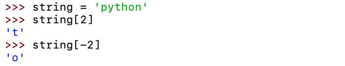 문자열에서 특정 인덱스의 문자를 가져올 수 있습니다. 첫번째 문자의 인덱스는 0에서부터 시작합니다. 그리고 문자열의 끝에서 부터 인덱싱하여 문자를 가져올 수 있습니다. 이 경우에는 마지막 문자의 인덱스가 -1에서 시작합니다.