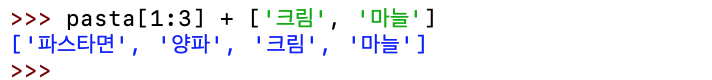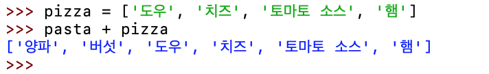 그리고 두개의 리스트도 병합도 가능합니다. 아래의 예제는 pasta 리스트와 pizza 리스트를 + 연산자를 이용하여 병합하는 예시입니다.